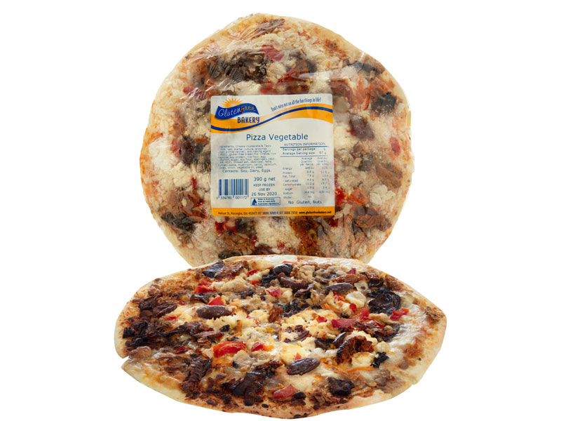 Gluten free bread mix [(starches (maize, rice tapioca), soy protein, rice flour, egg albumin, sugar, soy flour, stabilisers (461, 464, 412), Iodised salt, dextrose)],cheese (milk, salt, cultures, enzyme (non animal rennet), anticaking agent (460), tapioca starch, preservative (200), calcium chloride 509, citric acid)], water, Pizza sauce (tomato, salt), Mix Vegetable 21.1% [(mushroom, carrot, capsicum, tomato, onion)], Non-Hydrogenated Vegetable Oils & Fats [(sugar, emulsifiers (476), (471), preservative (202), acidity regulator citric acid (330), antioxidant (307)], yeast.